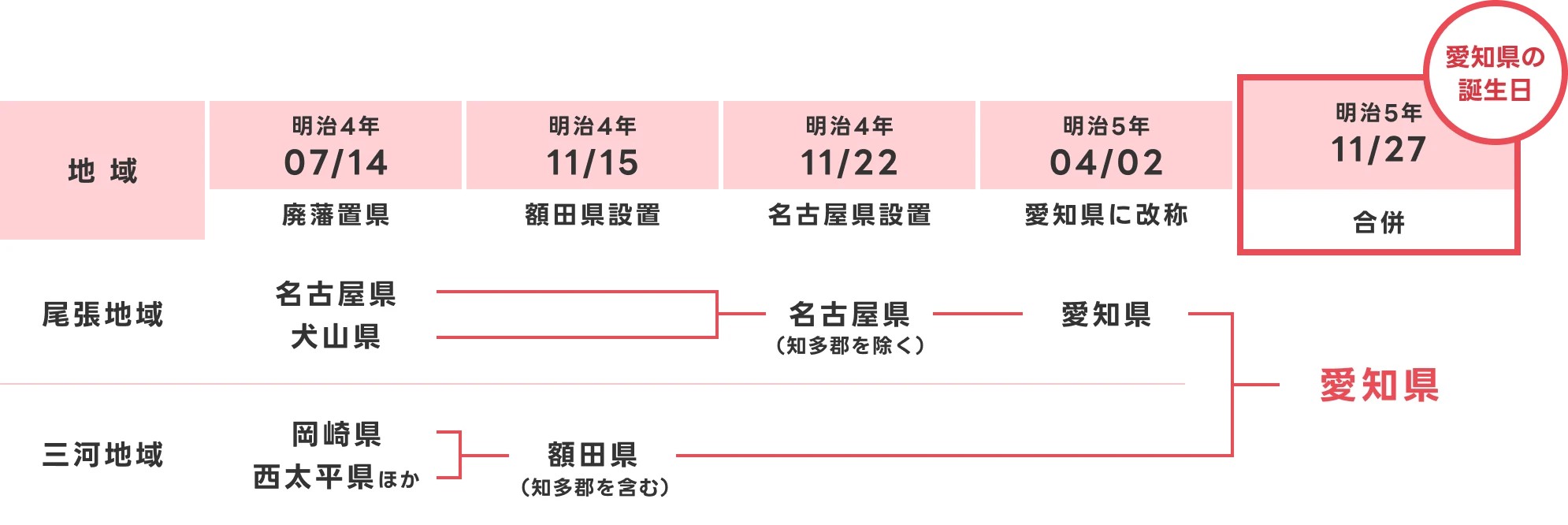 明治5(1872)年11⽉27日に、当時の愛知県(改称前は、名古屋県)と額田県が合併し、