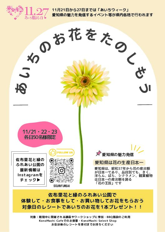 | 内容 | 期間中に体験工房の講座を体験したり、KonoMachi Cafeでお食事したり、Shopでお買い物したりするとあいちのお花を1本プレゼント。