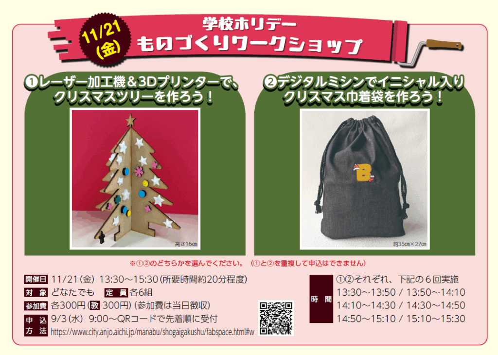 小さいお子様から大人まで楽しむことができます。 特に①については自由に飾り付けをすることができるので、個性豊かなものを作ることができます。②については、デジタルミシンが自動的に縫ってくれるので裁縫が苦手な方でも、完成度の高いものを作ることができます。どちらかお好きな方をお選びください! 内容: ①レーザー加工機&3Dプリンターで、クリスマスツリーを作ろう! ②デジタルミシンでイニシャル入りクリスマス巾着袋を作ろう! ※①②のいずれかを選んでください。(重複して申込はできません) 開催日:11/21(金) 13:30~15:30(所要時間約20分程度) 対象:どなたでも 定員:各6組 参加費:各300円(材料費300円) 時間:①②それぞれ、下記の6回実施 13:30から13:50 13:50から14:10 14:10から14:30 14:30から14:50 14:50から15:10 15:10から15:30 申込方法:あいち電子申請から先着順で募集中(参加費は当日徴収) |