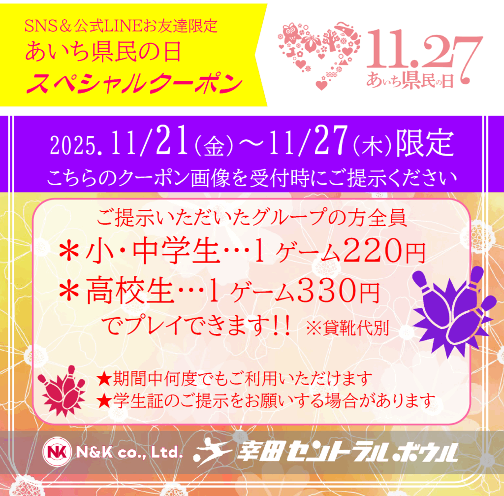 幸田セントラルボウル ボウリング優待 開催地幸田町 主催区分事業者等 割引き 日程 / 期間11月21日(金)~11月27日(木)内容割引電子クーポン こちらのクーポン画像ご提示で ★小中学生 1ゲーム220円 ★高校生 1ゲーム330円 でプレーできます ※貸靴代別開催場所 / 住所幸田セントラルボウル 愛知県額田郡幸田町菱池前田138-3主催 / 運営幸田セントラルボウル問い合わせ先幸田セントラルボウル TEL 0564-62-1711関連URLhttps://nandk.net/bowling/kodacentralbowl/イベント区分スポーツ 一覧へ戻る
