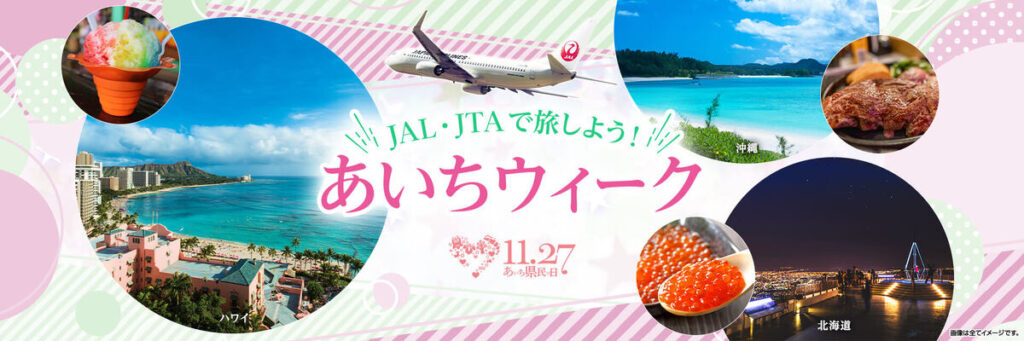 | 問い合わせ先 | 【公式サイト】 [国内] https://www.jal.co.jp/jp/ja/domtour/aichiweek/ [海外] https://www.jal.co.jp/jp/ja/intltour/aichiweek/ |