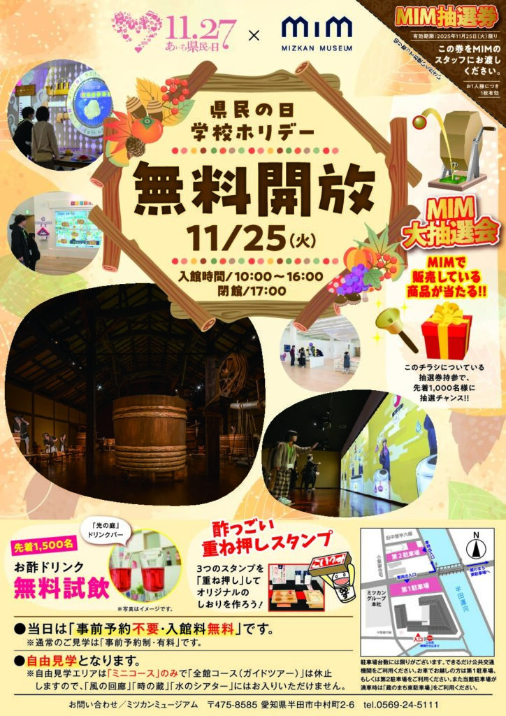 当日は事前予約不要、入館料無料の自由見学(ミニコースのみ、全館コースは休止)です。さらに、お酢ドリンクの無料試飲や抽選会などのお楽しみ企画満載! |